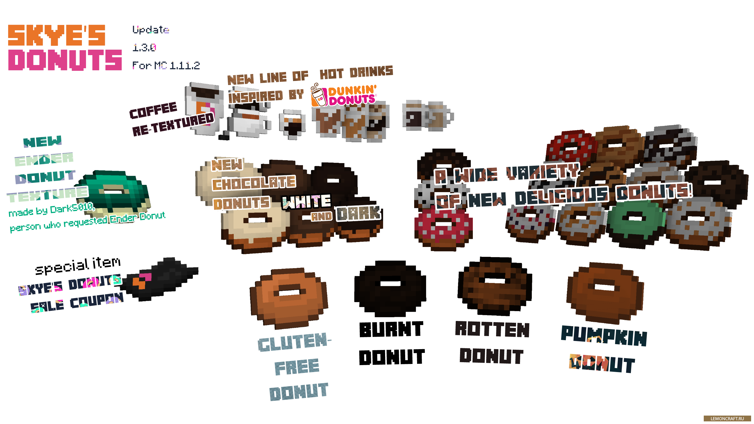 Простенький мод Skye's Donuts добавит новый виде еды в игру - пончики. Их можно скрафтить из стандартных предметов, они утолят ваш голод, а некоторые могут дать специфический эффект.